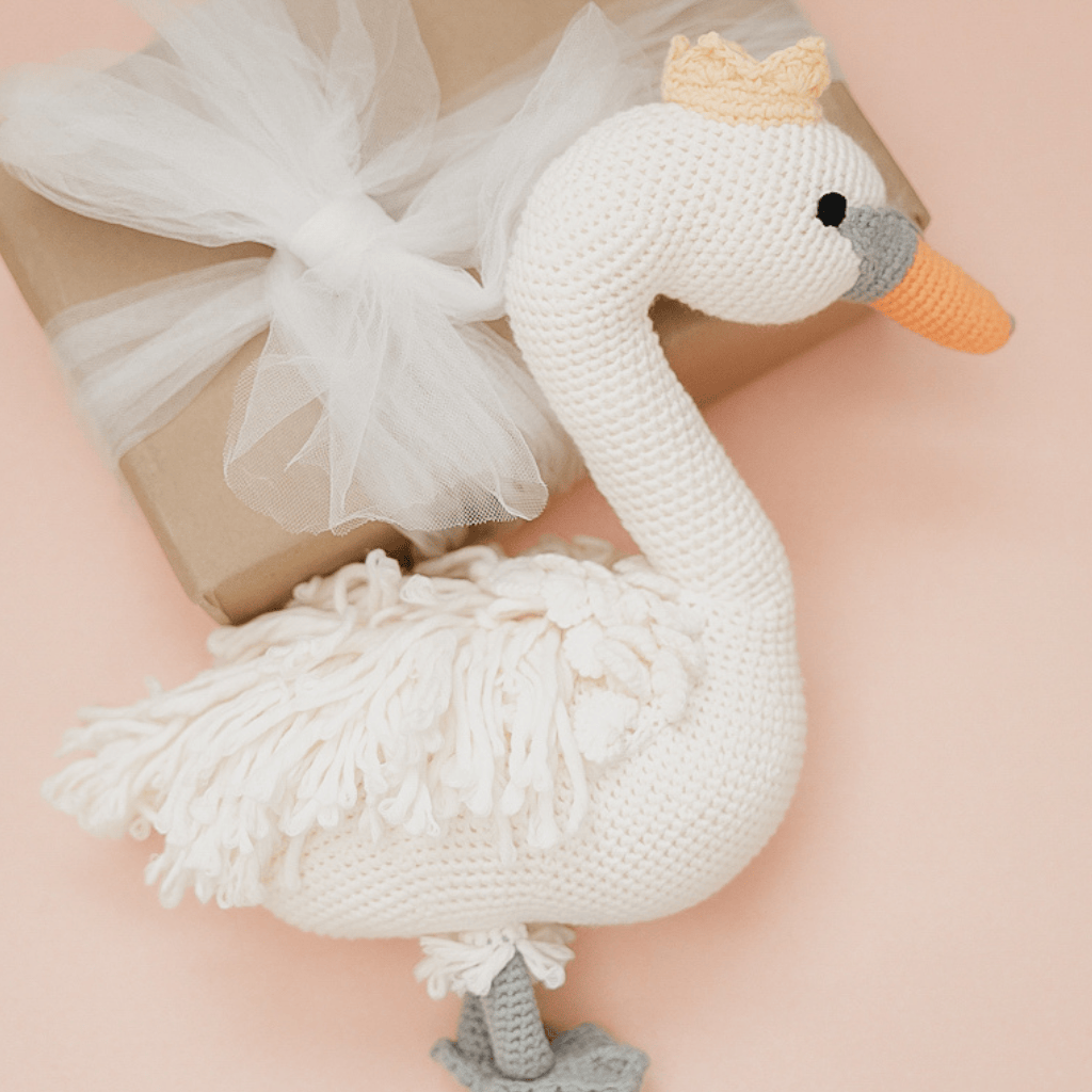 Soft as snowfall and graceful as a winter ballerina, Fiona the Swan brings a touch of fairytale magic to every cuddle. Hand-crocheted with delicate details and a tiny golden crown, she inspires stories, imagination, and moments of pure wonder. A timeless holiday keepsake crafted with love.